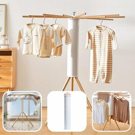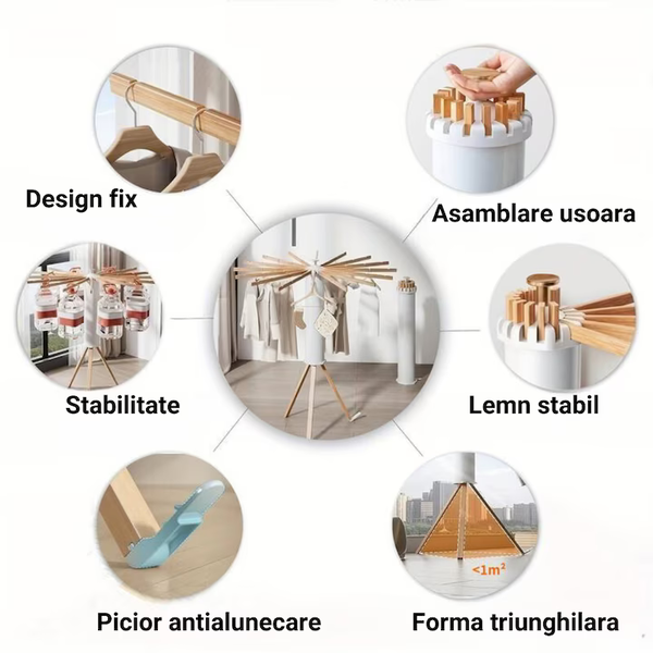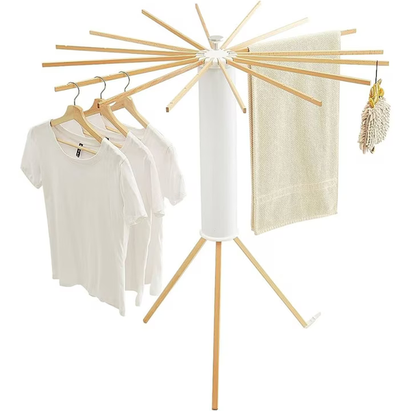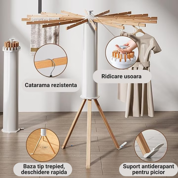 Uscător din lemn rezistent, pliabil și ușor de depozitat. Dotat cu 12 bețe, se rotește 360° și oferă organizare rapidă și eficientă. Perfect pentru uscare, depozitare sau aranjarea garderobei: compact, versatil și gata de utilizare.