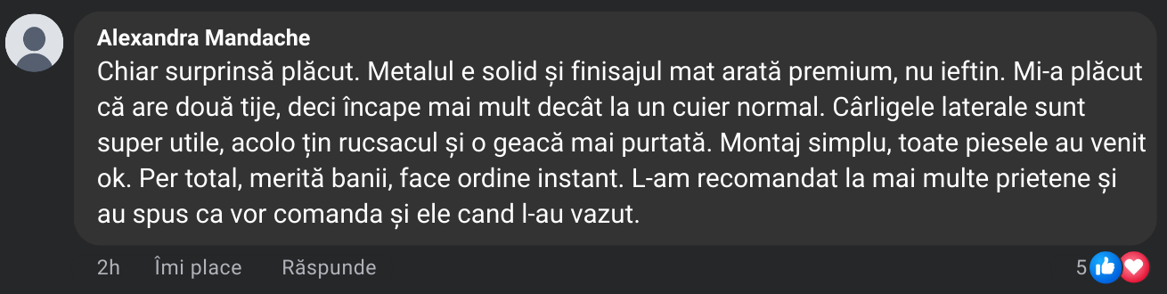 Două bare superioare pentru umerașe, suport inferior pentru pantofi și cârlige laterale pentru genți sau pălării. Potrivit pentru haine de diverse mărimi – de la jachete la rochii lungi.