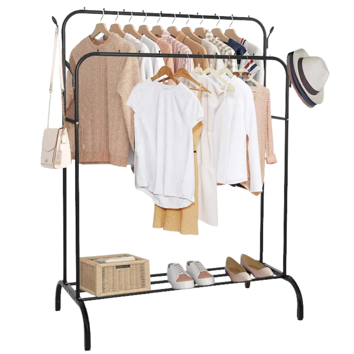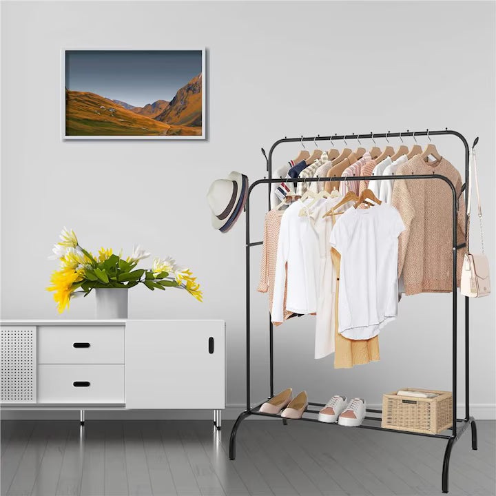 Suport metalic robust cu finisaje profesionale, ideal pentru organizarea rapidă a garderobei. Dotat cu două bare pentru umerașe, cârlige laterale și suport inferior pentru pantofi, oferă spațiu eficient fără a ocupa mult loc. Perfect pentru dormitor, hol sau dressing: practic, stabil și ușor de asamblat.